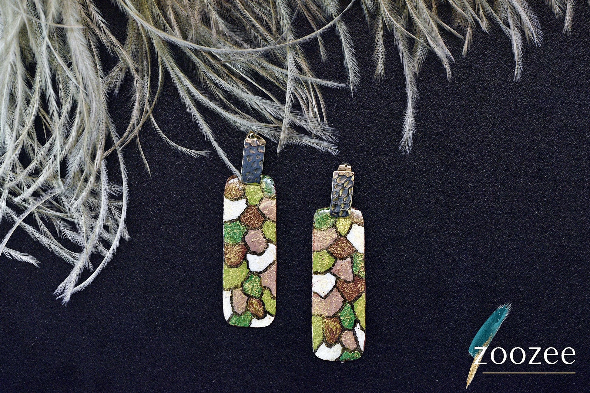 Earth Tone Mosaic Rectangle Earrings Textured Statement Jewelry Gold Black Detail